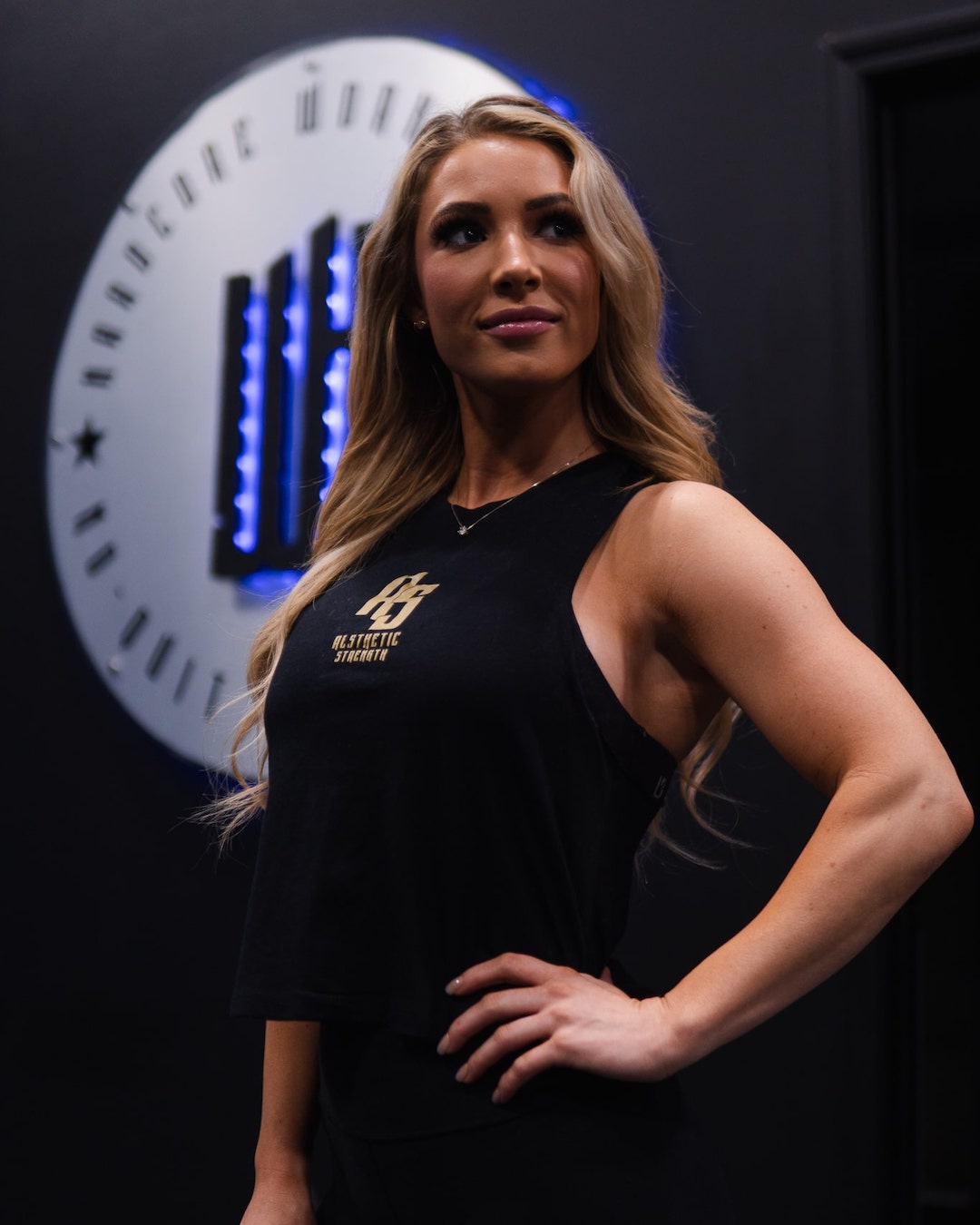 Flowy, super-soft blank crop tank with a gold shimmer print. Perfect for arm day and warm weather.